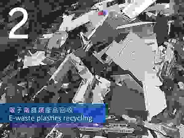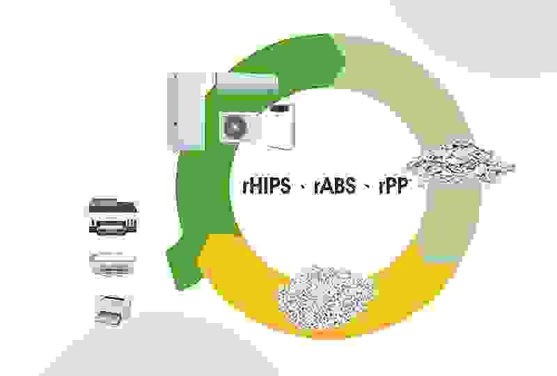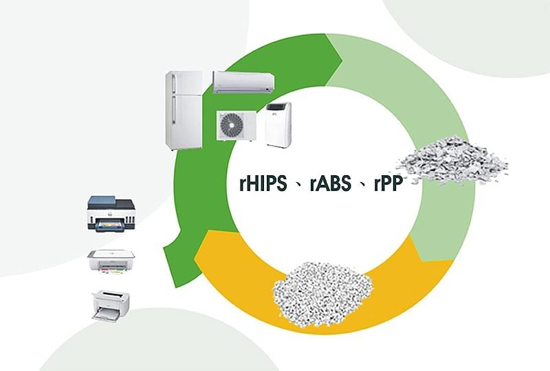 Recycled plastics from waste appliances, mainly HIPS, PP, and ABS, plus PP and HIPS from other waste sources.